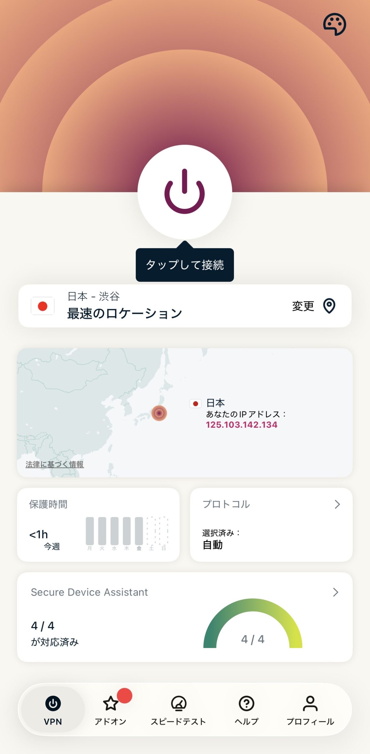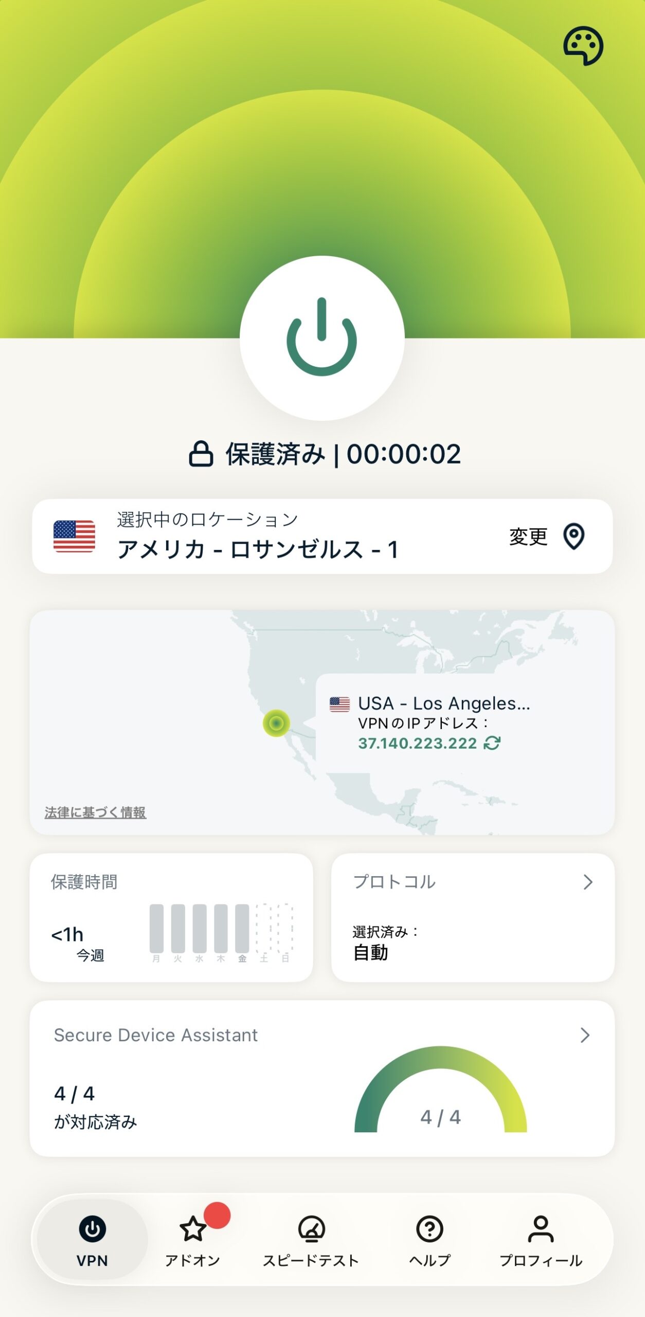 正常にVPNがスマホに設定されると、ExpressVPNアプリに接続済みと表示されます。
