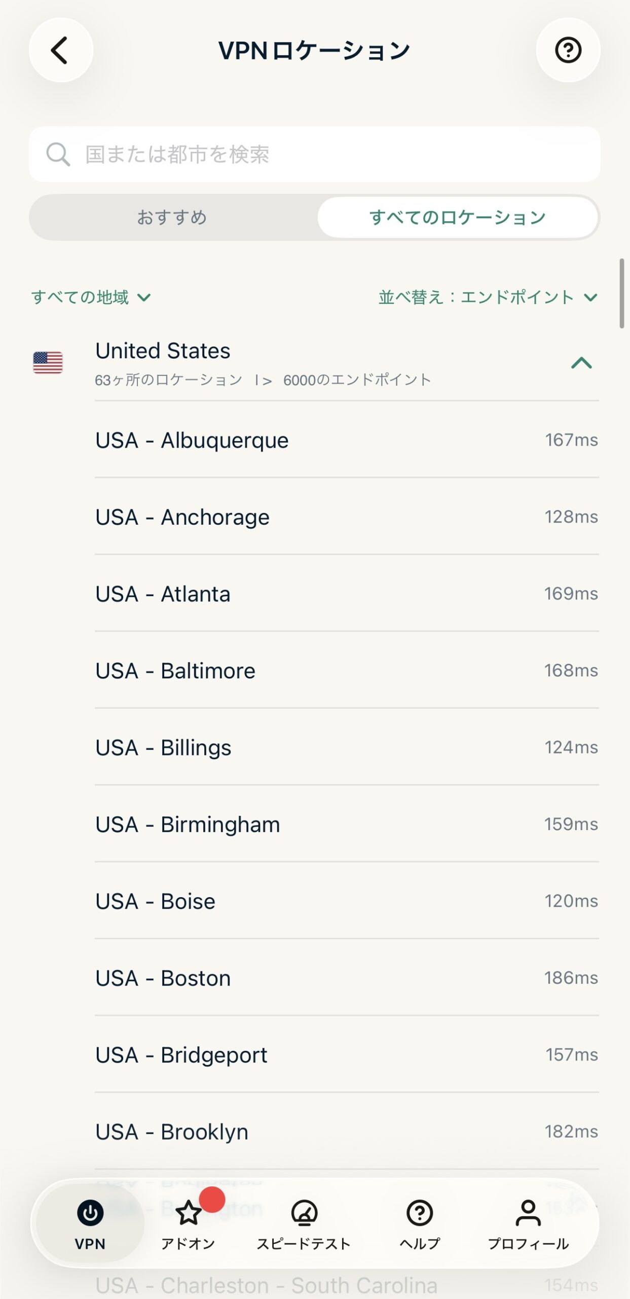 別の都市のVPNサーバーに切り替えるだけで、VPNの速度やつながりやすさが改善されることも多い。