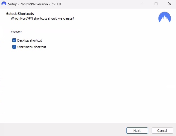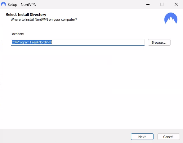 NordVPNのインストーラが起動します。インストール先のフォルダを確認してNext(次へ)をタップ