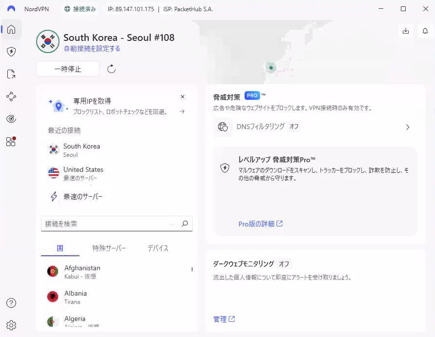 韓国ソウルのVPNサーバーに接続できた
