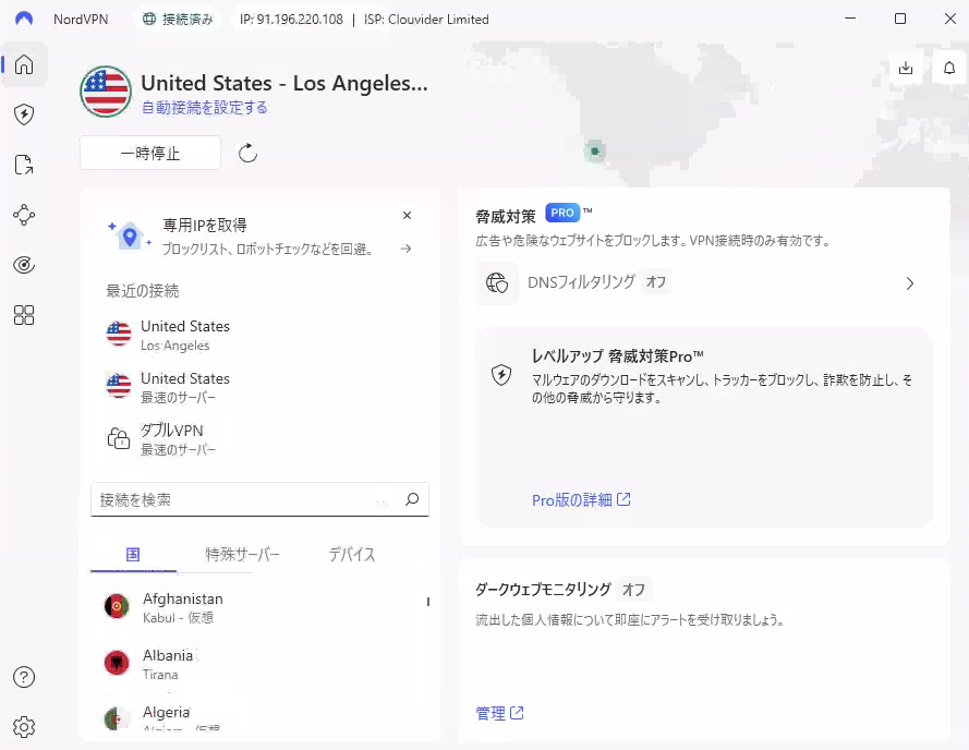 Windows PCが正常にVPN接続できるている場合は、NordVPNアプリの左上に接続済みと表示されます。