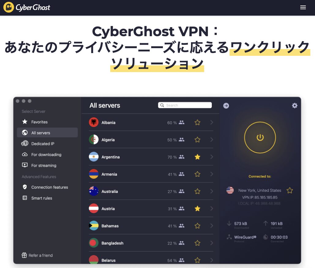 ハッカーや企業がVPNサーバーの内部を調べたとしても、Cyberghost VPNのVPNサーバーを通ったデータ記録は何も保存されていない状態です。