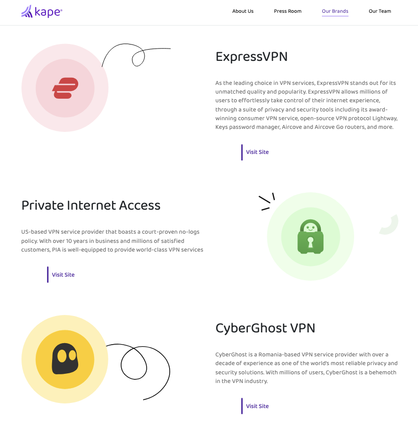 - Cyberghost VPN運営会社の親会社Kape TechnologiesはExpressVPNをはじめ大手VPNを複数ブランド展開するイギリスの上場企業