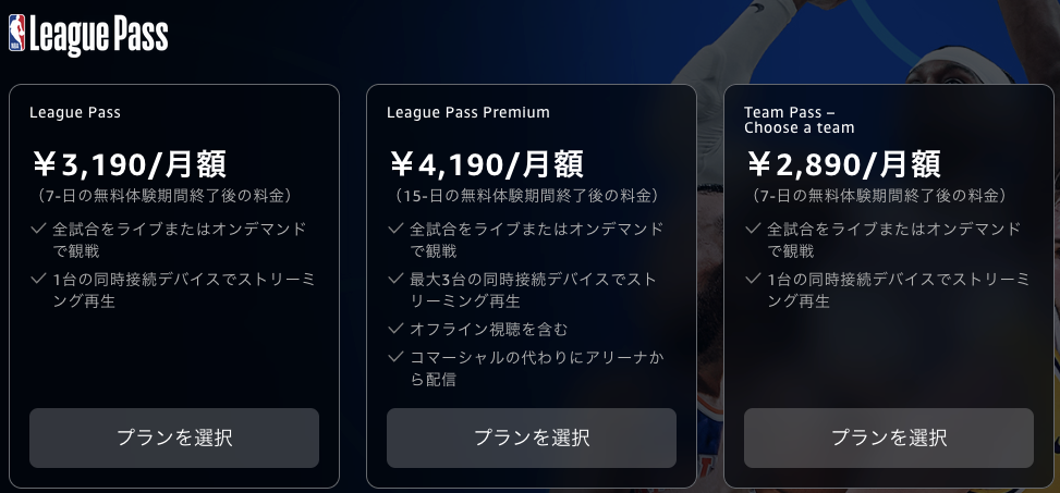 AmazonのNBAリーグパスの料金は3つのプランから選択できます。