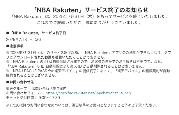 NBAの放映権から楽天グループが撤退しサービス配信が終了した