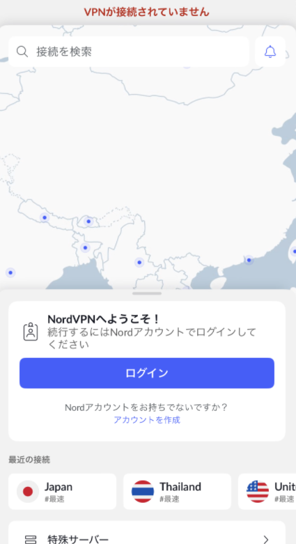 iPhoneにNordVPNアプリをインストールして、表示された画面でログインすれば追加料金なしで使えます。