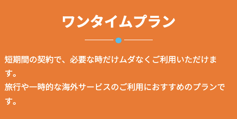 ワンタイムプランは何度でも利用できるので、海外旅行矢海外出張、一時的に海外のサイトやサービスへのアクセスを行いたい場合に便利です。