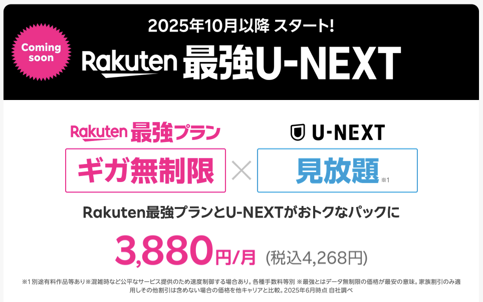楽天モバイルとU-NEXTは「U-NEXT」をギガ無制限で利用できる「Rakuten最強U-NEXT」を2025年10月から提供します。