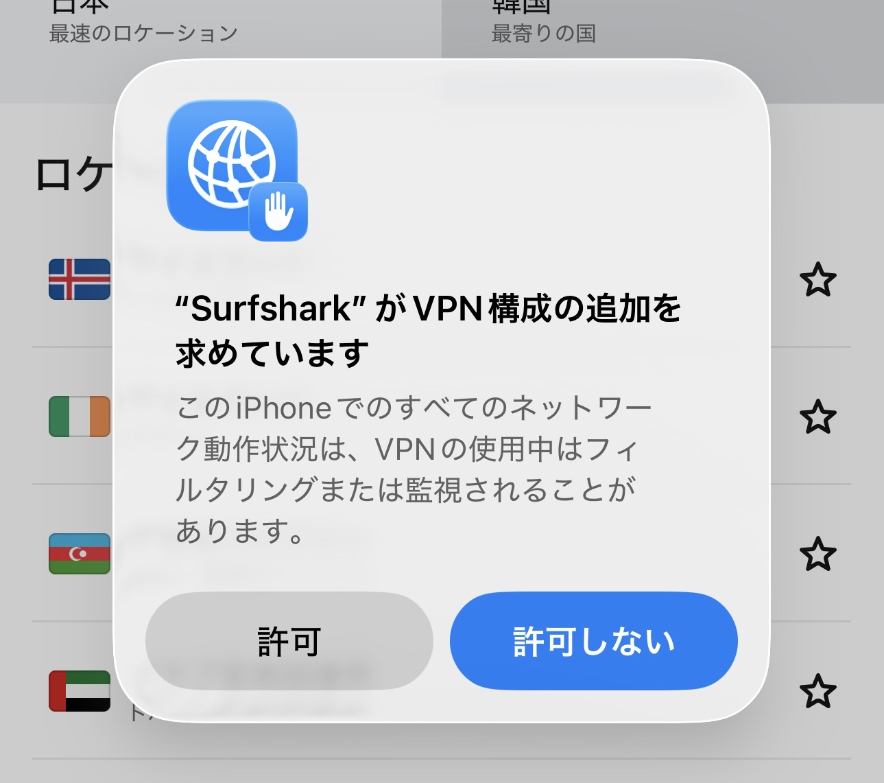 VPN構成の追加を求めていますのポップアップが表示されたら、許可をタップ。