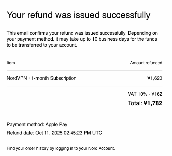 NordVPNのiPhoneアプリ内課金は返金保証の対象外です。